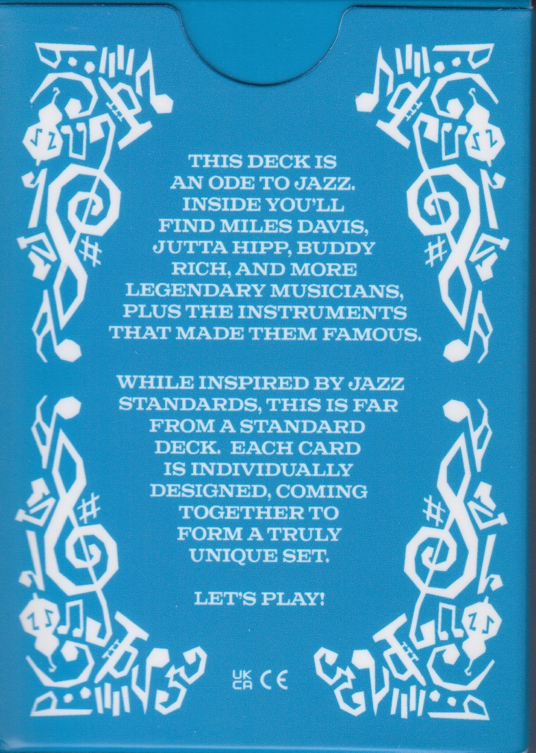 While inspired by jazz standards, this is not a standard deck. Each card is individually designed and illustrated, coming together to form a truly unique set. Instead of hearts, clubs, diamonds and spades, this deck reimagines the suits as Horns, Drums, Keys and Bass - the four instruments at the heart of a jazz quartet. And for the picture cards, we’ve dealt you something different. Inside the pack, you’ll find iconic jazz legends like Miles Davis, Jetta Hipp, Buddy Rich, Art Blakey, and many more. Housed in a beautifully designed tuck box, this isn’t just a set of playing cards. It’s an ode to jazz.