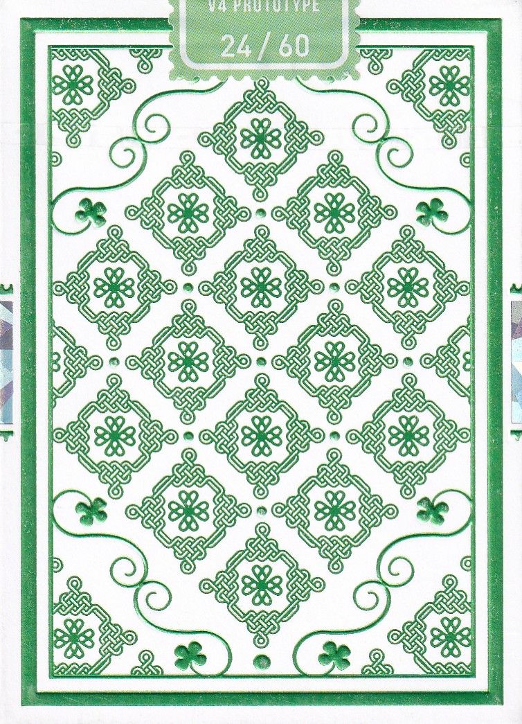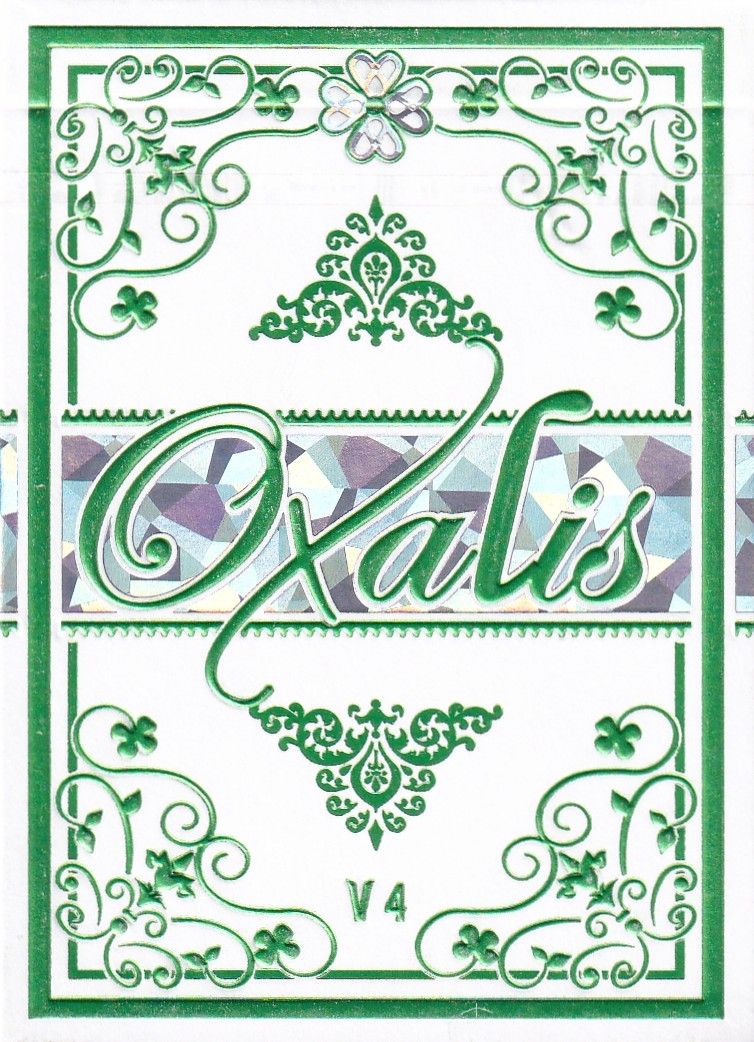 Oxalis V4 will have green as its main color. In summary, the choice of color is a tribute to the trifoliate leaves of Oxalis, a distinctive feature of this plant. The trifoliate leaves, in fact, each have a heart-shaped leaflet with the tip consisting of the petiole. Each part of the deck refers to the leaves of the oxalis, whose special shape is repeated several times in both the box design and the cards, particularly the pips are leaf-shaped, trying to remain a clean and recognizable design. The tuck box features premium 280gsm card stock, two different foils, die-cut elements, and embossing. The cards feature 310gsm premium German linen card stock with black core, Butter Finish, card back (CMYK PRINT), Holo patterned gilding, and are fully customized (back design,pips,standard courts, aces and jokers).