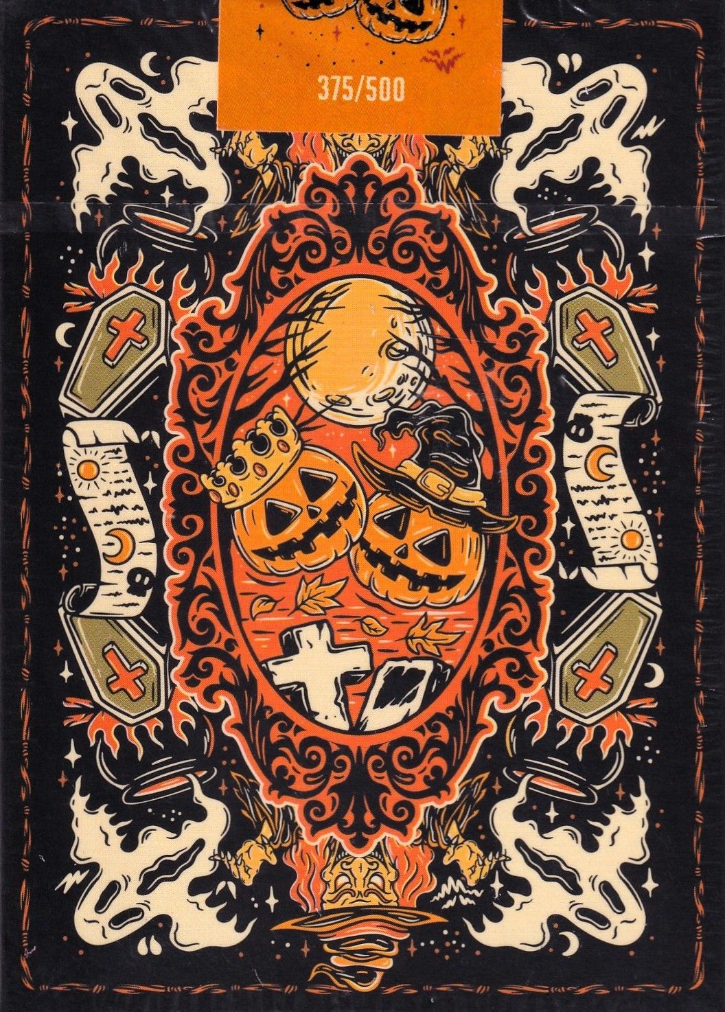 Good Pals Halloween Tales is a fully custom deck of cards featuring Halloween art on every card! We've added more color to our 2nd volume of Halloween Tales, We've experimented here! The first time we have gone for an all-black deck of cards. Using this kind of technique allows for brilliant contrast when using the right colors, and along with our designer, @47kills, we believe we've nailed this one and anticipate this to be our best-seller. From our standpoint, the dark background is really eye-catching, and the touches of orange seem to compliment this design really well. We believe the dark backgrounds really bring the court cards to life. We have also been able to extend the background artwork in this deck significantly to the V1 Halloween Tales, which had a narrower border. The number cards have a fresh look, or at least the spades and clubs do. We have inverted the colors to a bone white and the contrast on the black cards looks really nice! All of the aces in Halloween Tales builds upon the artwork from the number cards, except making them bigger, better and bolder.