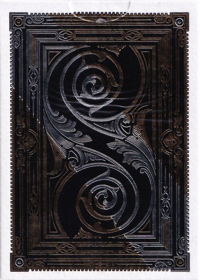 More Playing Cards are an expanded version of Less Playing Cards. The back design is expanded to make a full card back in which the colors of silver and gold clash. The artwork on the front of the cards is also expanded with more detail and borders. More Player's Edition features cards printed on playing card stock with gold and silver metallic inks on both sides and a tuck box printed on white stock, using black, gold and silver foils with embossing.