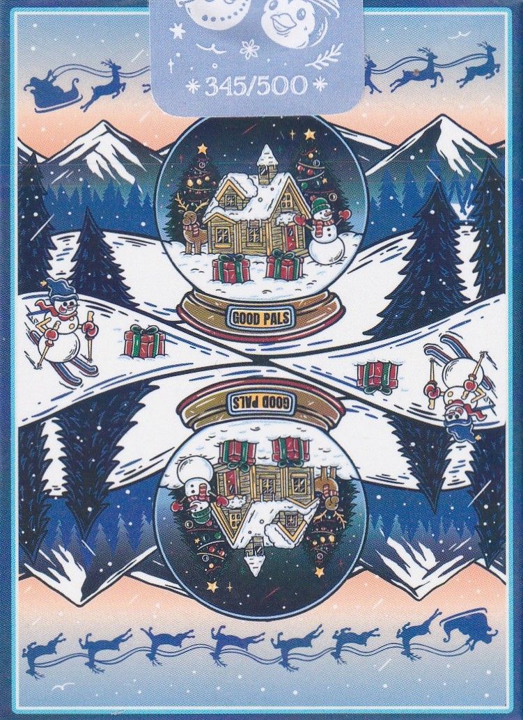 Good Pals Christmas Playing Cards - a magical celebration of Christmas spirit, captured in four beautifully illustrated decks. These decks feature Santa, snowmen, reindeer, gingerbread folk, and all your favorite holiday characters - the perfect gift or collector’s piece for the holiday season! Each edition of the Christmas playing cards has a fresh tuck design and back design. This is especially more so with the Snow Globe deck which has an entirely new back design concept. The number cards on this limited edition deck feature red and blue foil as well as some foil accents on the aces.