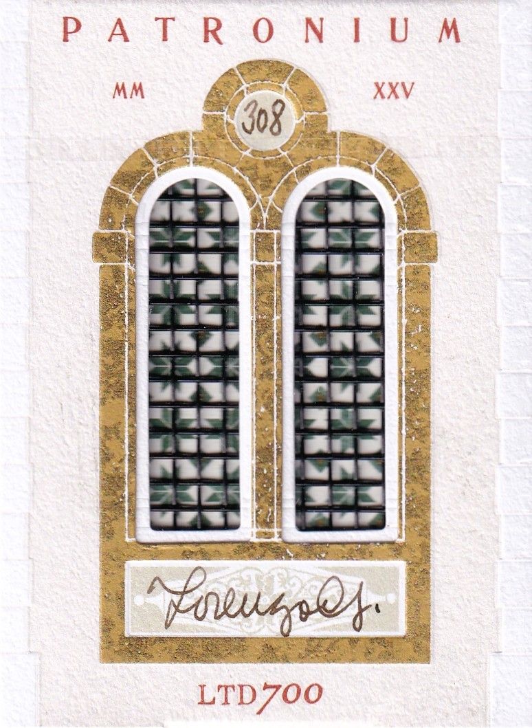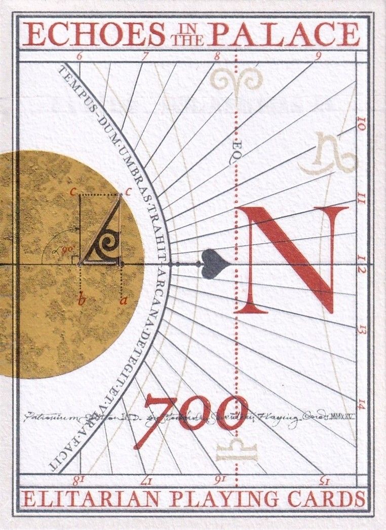 Echoes in the Palace is a custom, divination-inspired deck that was part of the 2025 S17 Patreon Annual Reward. The 56-card deck is designed as a continuous visual experience, with all cards sharing a common "palace" background so that they form a large, unified image when laid out together. Its court cards are "one-way" and arranged in a triptych format, where three cards side-by-side create a single theatrical scene, while the number cards follow an "old-school" design that omits traditional indices. The Patronium Edition features a tuckbox printed by Boschiero&Newton on beautifully textured cotton paper with extensive embossing and debossing to enhance specific design elements as well a die-cut windows on the back. The cards feature cold foil on the backs and gilding.