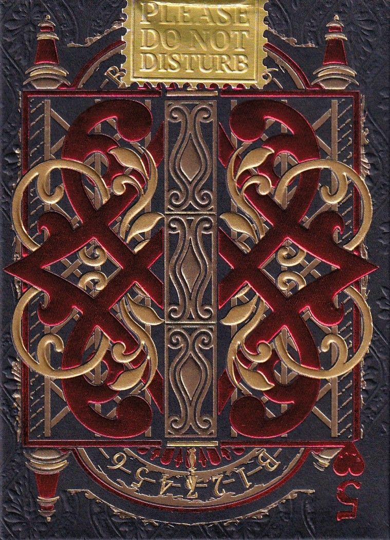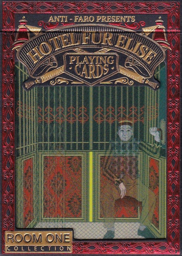 The Hotel Fur Elise Playing Cards are a tribute to the haunting tales of lost souls and forgotten tragedies. Where vengeful spirits linger, forever trapped in the moment of their demise. Inspired by the tales of haunted houses. These decks blend the hotel’s lavish, early-century aesthetic with the unsettling stillness that followed the breach. Ornate patterns frame glimpses of the tragedy, turning each card into a piece of the grand, terrible spectacle that now forever haunts its halls. An eternal servant of the hotel is stationed sentinel on this case. With a tilt of the box, the lenticular print shifts, and the spectral porter comes to life. His hollow grin following you, one hand eternally bound to the control lever. Handle his image and feel the chill of his unfinished duty.