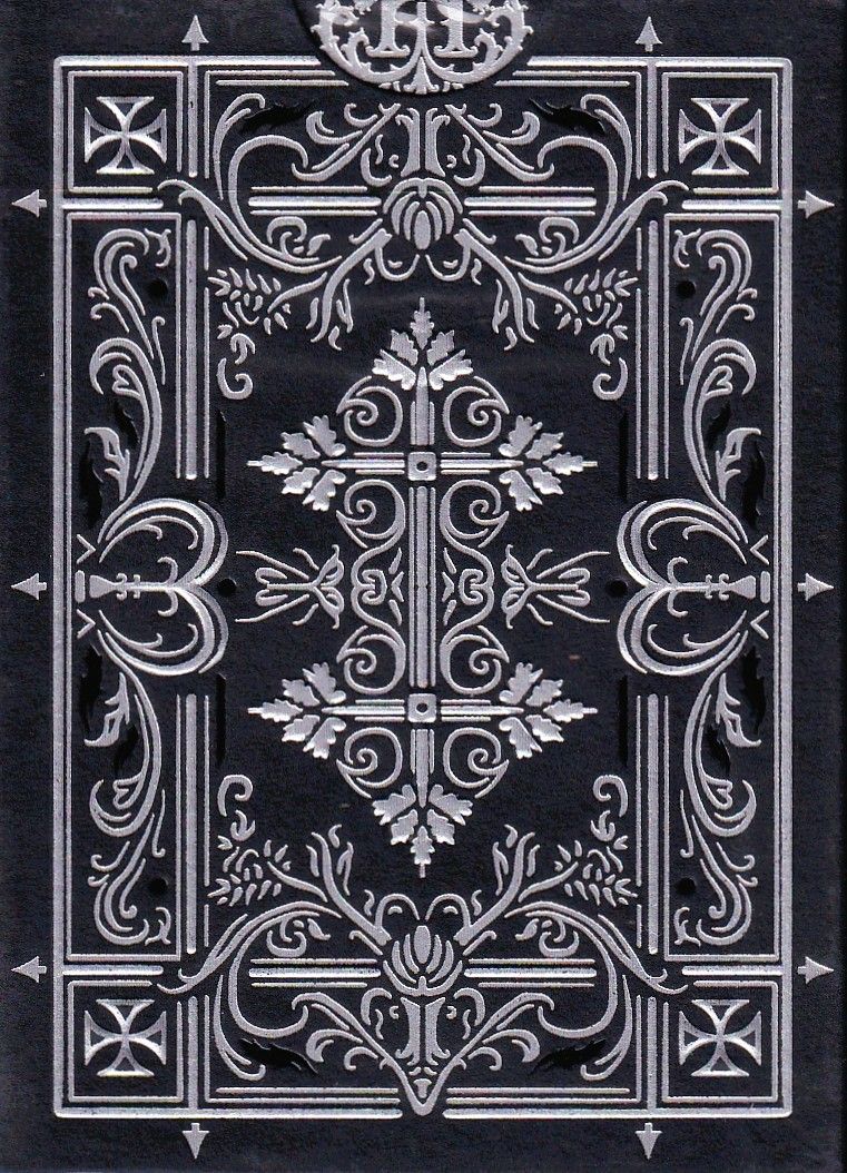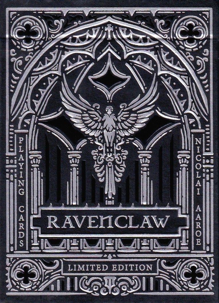 Iron Hollow is a Victorian Gothic Romance, designed and illustrated by Nicolai Aaroe, telling the tragic lovestory of twelve central characters, all inspired by gothic folklore and legends. It is an illustrative storytelling and a luxurious set of playing cards all at once. This project is the next volume in the Trials playing cards series, and as such carry the same overall artistic style and idea as the Vengeance of Witches project. The Ravenclaw tuck is a gothic ornamentation, taking inspiration from gothic portals of mausoleums and Victorian tomb stones, while featuring an iconic raven. It is manufactured with black and silver foil, strategically embossed on a matte, black stock. The Ravenclaw deck has a silver gilding, which represents the cold steel of blades, jewelry and silver tipped bolts.