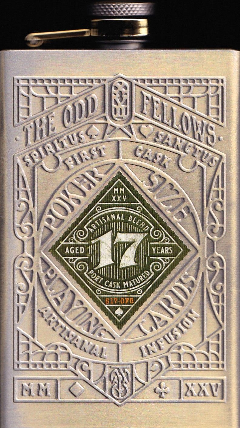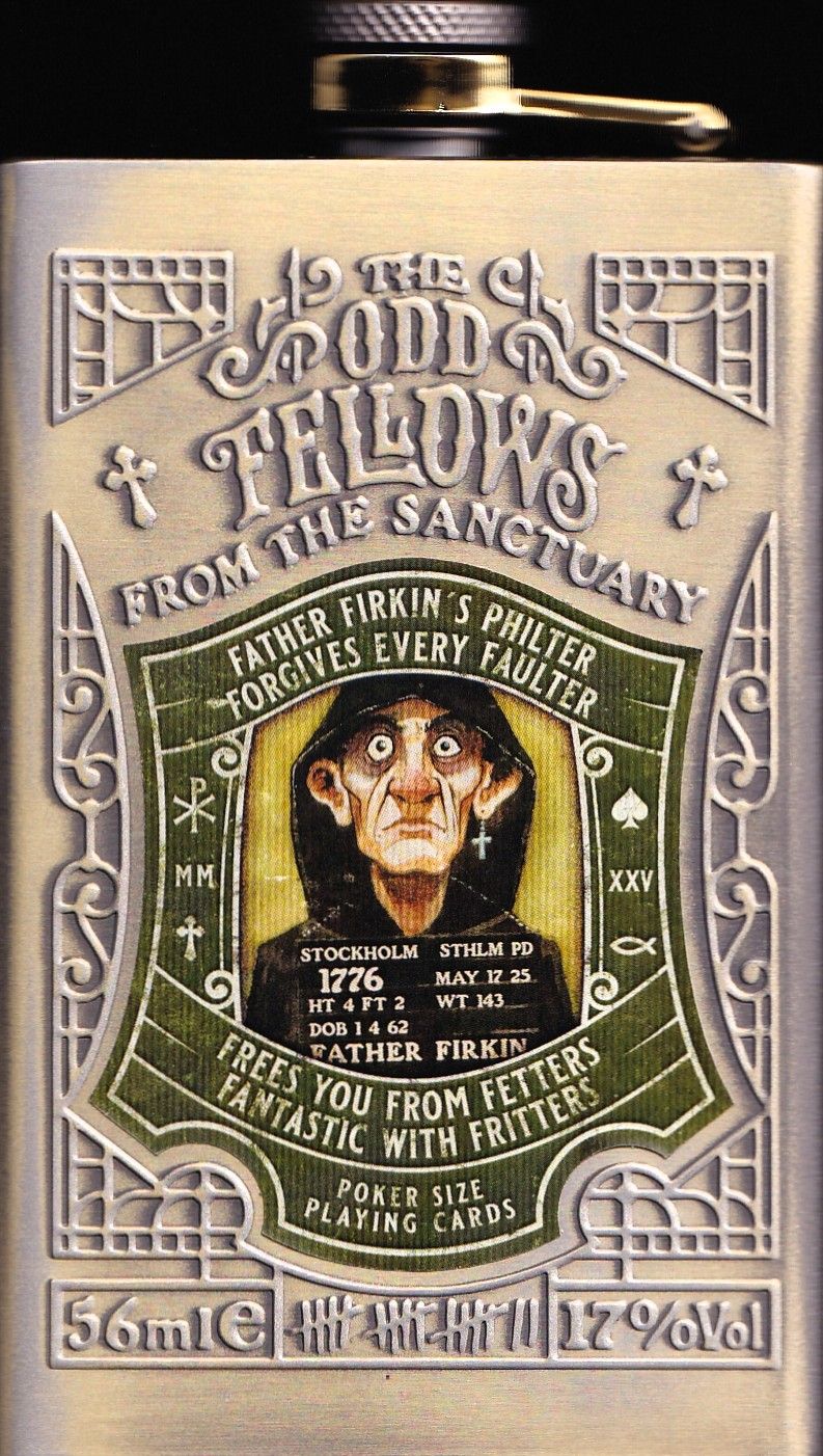 Evidence seized at The Sanctuary — home of a gang of petty criminals disguised as clergy, plotting heists, bootlegging spirits, and running crooked games. Inside this stainless steel hip flask (pale brass tint, embossed on all sides) lies a poker-size deck of playing cards featuring the Odd Fellows from the Sanctuary. The deck features gold foil application on the backs, metallic wasabi green gilding, and housed in a embossed Hip-flask in stainless steel, pale brass tint, with bottom lid that serves as the box for the deck.