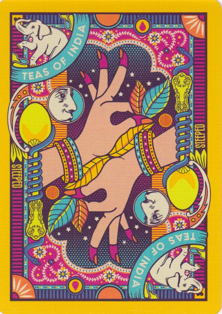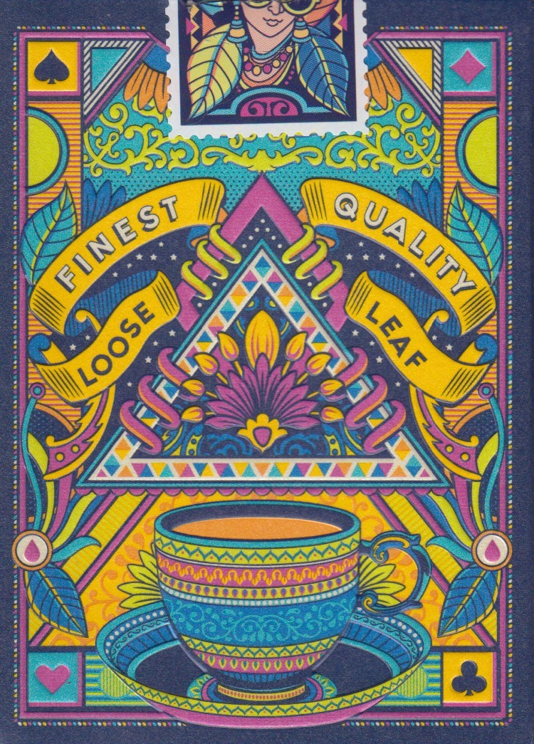 STEEPED (Teas of India) Playing Cards, the deck that enters the world of the Indian Chai Wallah. The suits represent four speciality teas from different regions of India: Assam, Darjeeling, Kangra and Nilgiri. The tuck box is designed in the Indian maximalist style, featuring bold colours and vibrant patterns reminiscent of Indian folk art. The tuck box is printed on beautiful shimmering pearlescent paper stock and features embossed elements to give a luxurious finish. The neon colours contrast with the style of vintage engraved silverware, making this deck pop. The tuck back features a detailed teacup filled with freshly brewed, finest quality, loose-leaf tea. The inside of the tuck box is lined with a detailed diamond pattern in mustard yellow. This contrasts perfectly with the flash of pink from the foil gilt cards inside.