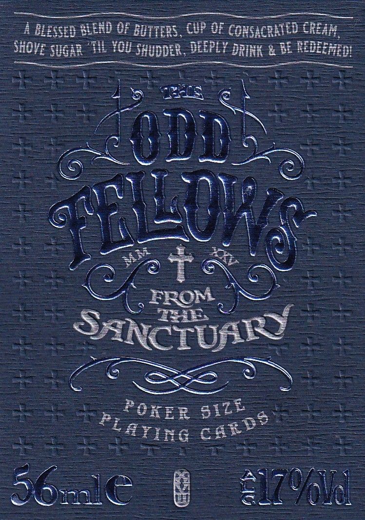 Evidence seized at The Sanctuary — home of a gang of petty criminals disguised as clergy, plotting heists, bootlegging spirits, and running crooked games. The deck features gold foil application on the backs, metallic cornflower blue gilding, and a tuckbox with dark green paper, foil, and embossing.