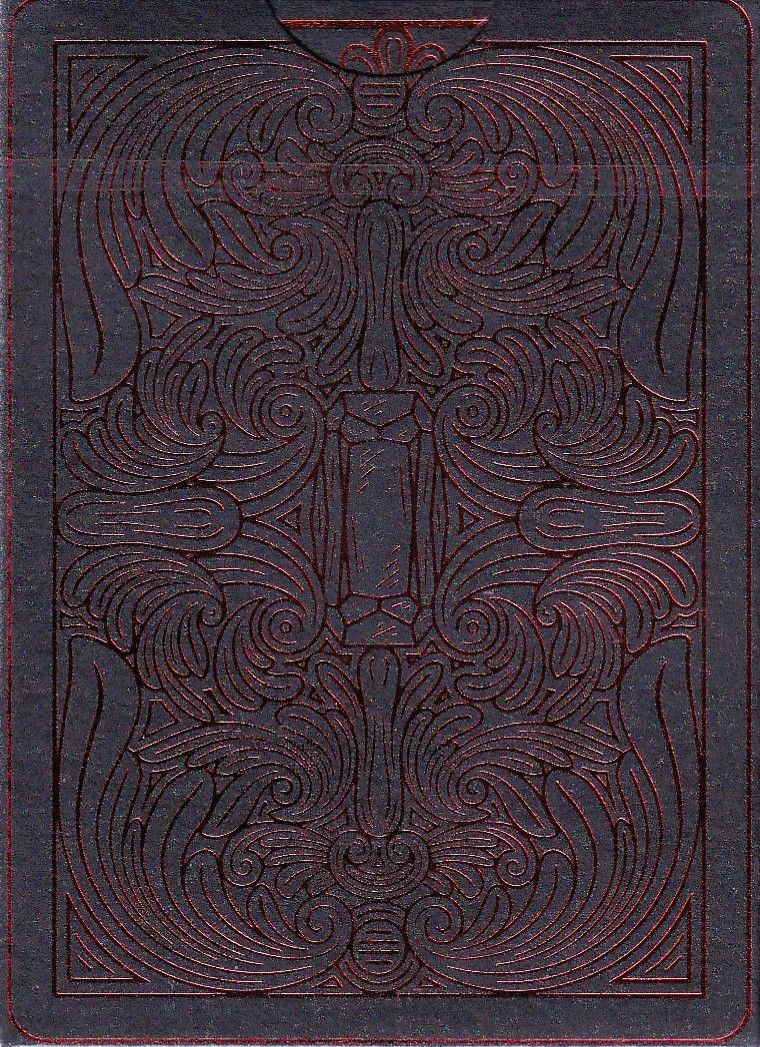 The Nameless Gem is a high-end collector's deck by Azoth that emphasizes heavy metallic textures and intricate geometry. Its defining feature is the extensive use of deep red foil on both the front and back of every card, creating a shimmering, near-metallic look. The die-cut tuck box is crafted from premium matte stock, featuring a structural window that showcases the "gem" motif of the cards within.