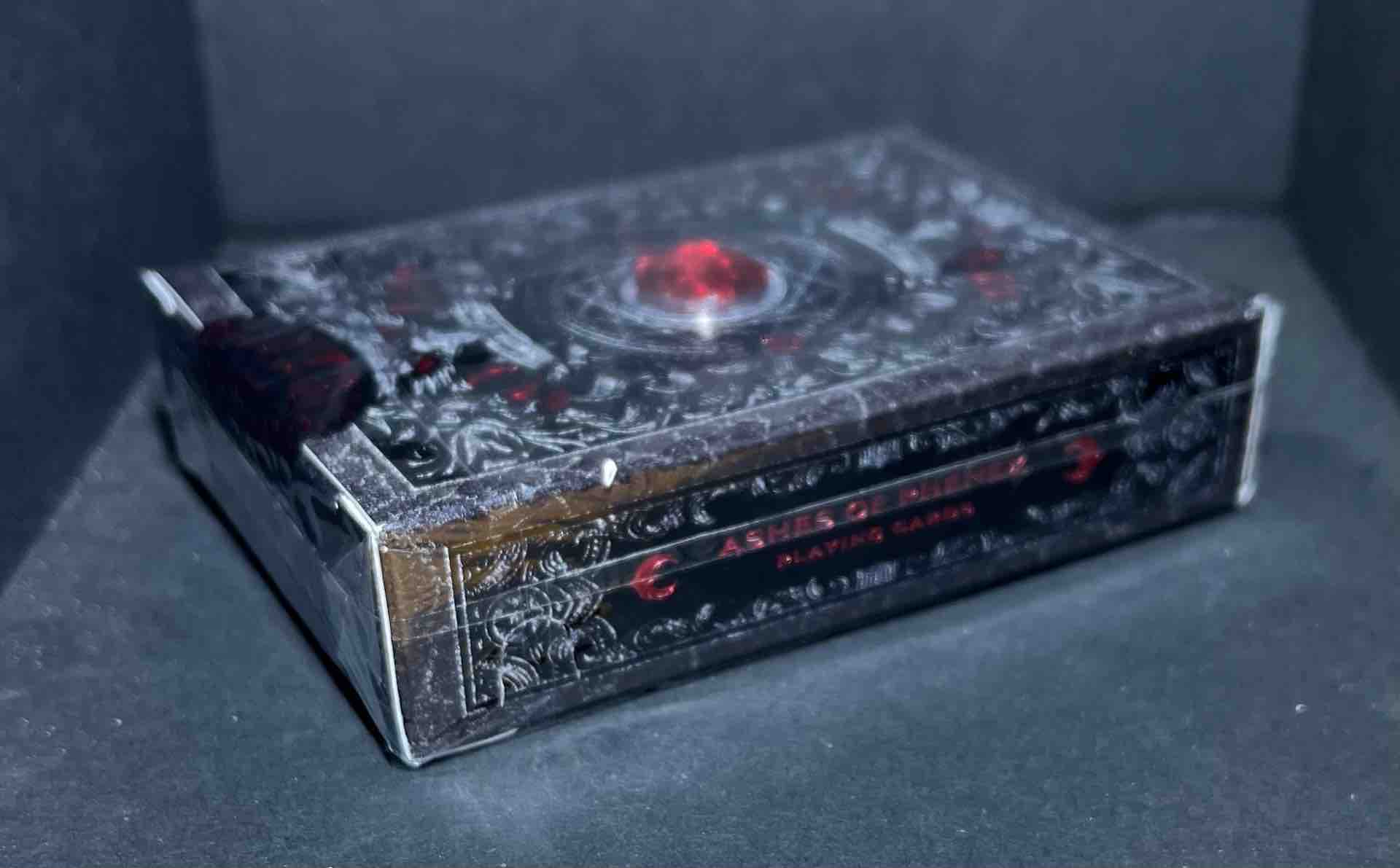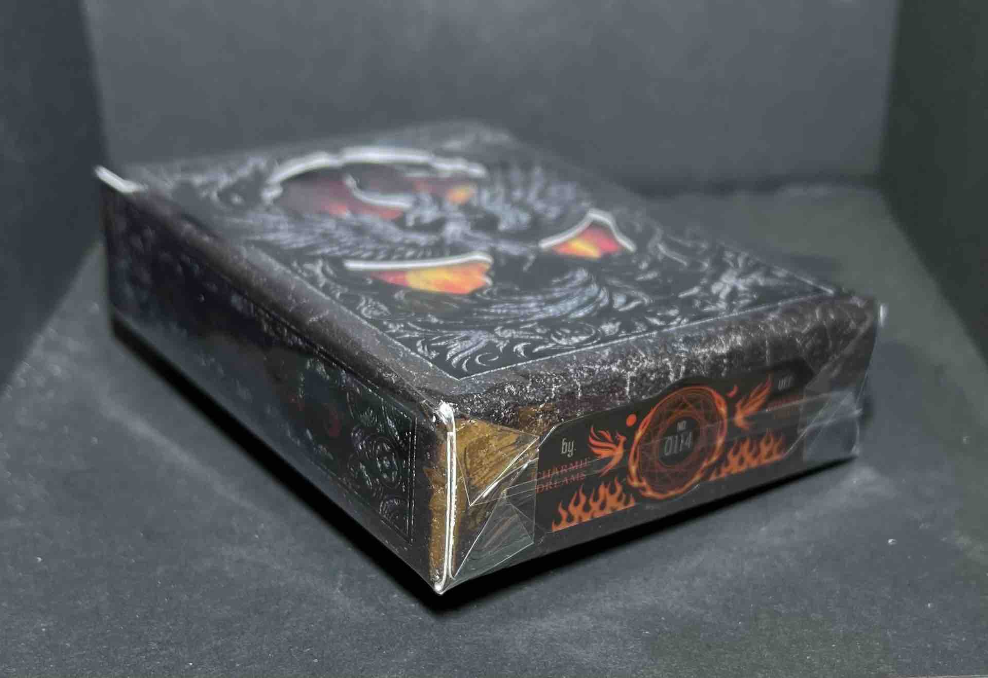 PHENEX REBORN Heat-sensitive Playing Cards. The REBIRTH deck features a 3D embossed copper plate with holo-red foiled phoenix ornament. The Ashes deck features intricate carbon-carving art that captures the essence of Phoenix rebirth. All face cards are adorned in full cold foil.