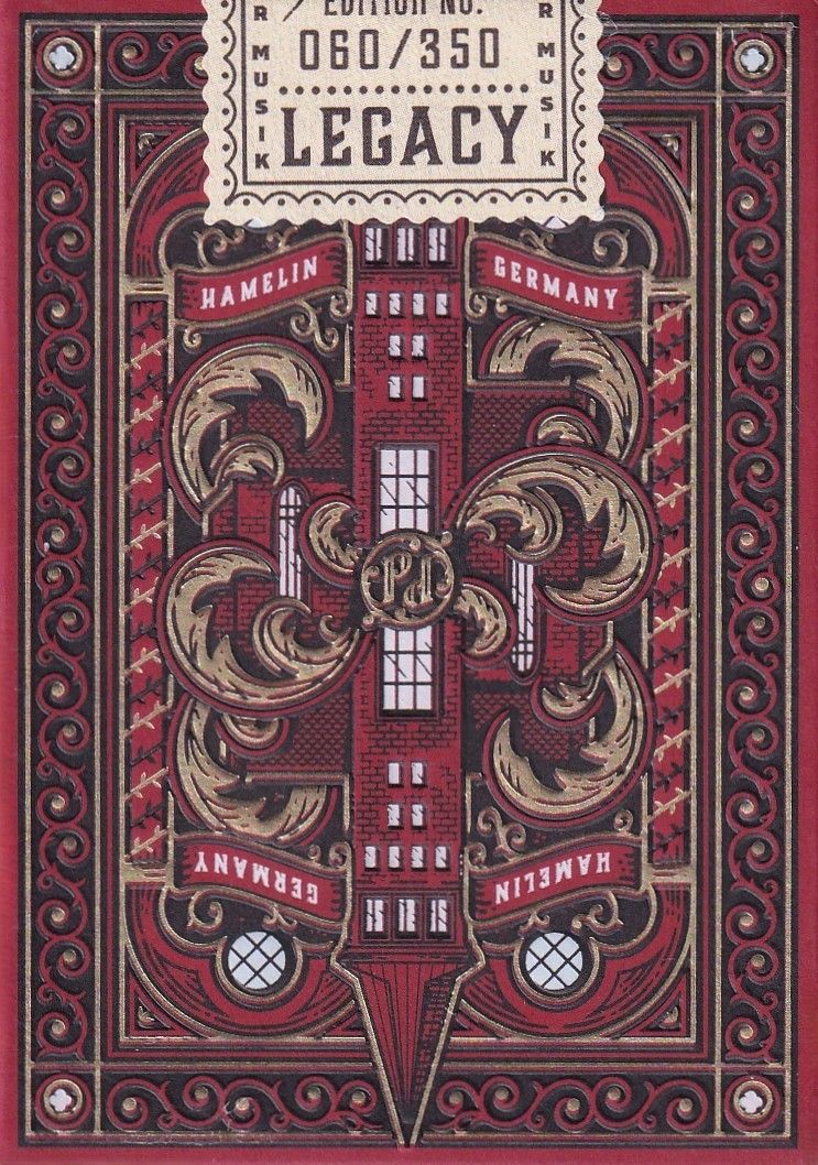 Pied Piper playing cards capture the old-world splendor of the storied town of Hamelin (Hameln in German), the whimsical nature of the Pied Piper's magic flute, and the darkest elements of this fabled tale. The Heirloom Legacy Edition is the most carefully crafted edition of the Pied Piper Playing Cards, designed with collectors in mind. This edition builds on the Heirloom Edition’s deep red and gold design, adding details that highlight the historical significance of the Market Church of St. Nicolai and its role in the legend. The Heirloom Legacy Edition features gold gilding and comes in a custom tuck box designed to showcase its details. Side cutouts allow the gilded edges to be visible even when the deck is inside, while a front cutout reveals the highlight of this edition—a two-sided metal card.