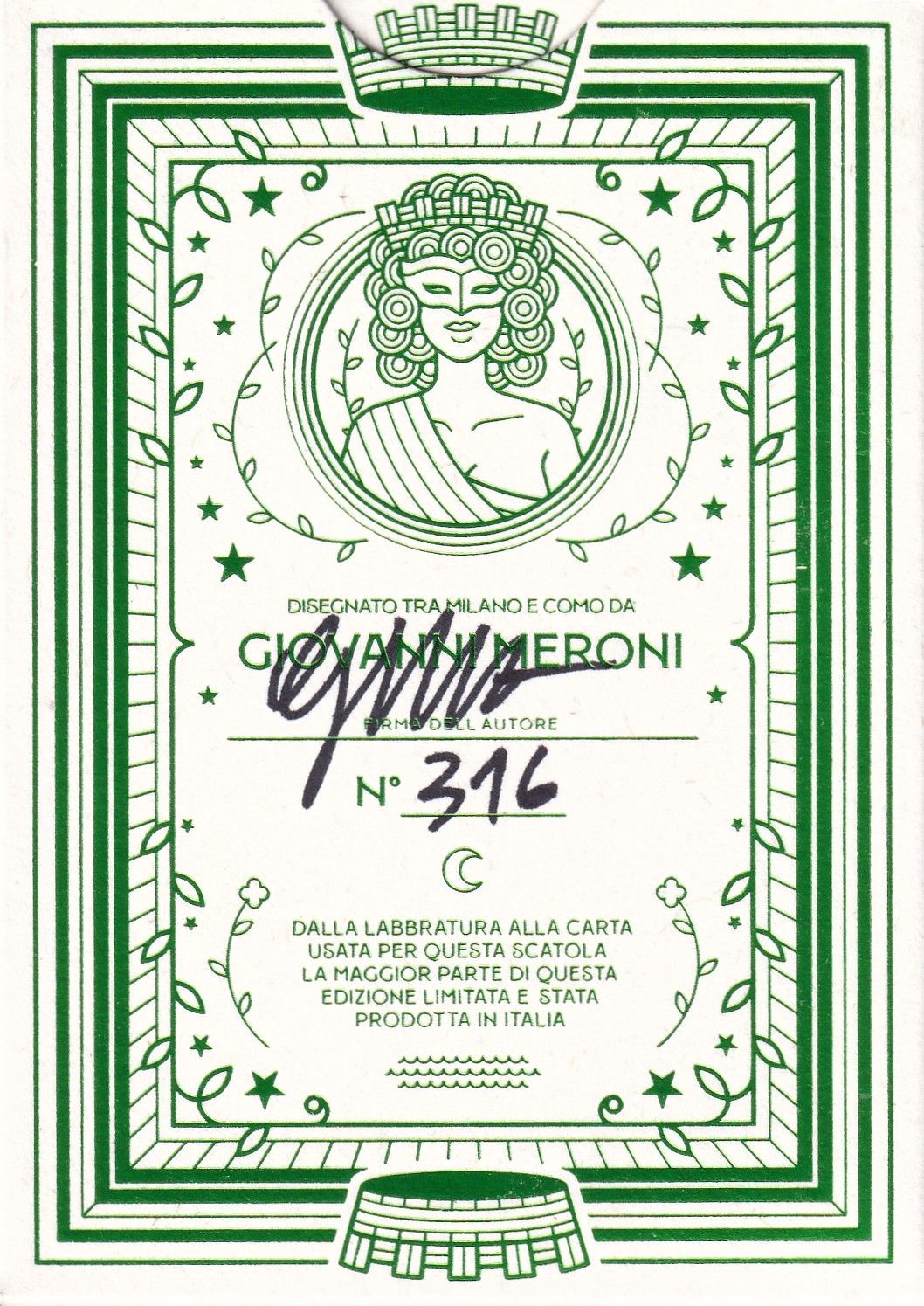 Italia Preziosa and Italia Lucente are the most “Italian” Signature Editions of Thirdway Industries and are Eternal Editions (EE) mainly reserved for TWI Patrons. The decks are hand-signed and numbered in Italy by the author, Giovanni Meroni and feature a lacquered edge print by Doliberg in Bergamo. The luxury tuck box was produced by Boschiero&Newton in Jesolo, with Italian papers and foils. The cards were printed by USPCC in the US with metallic ink.
