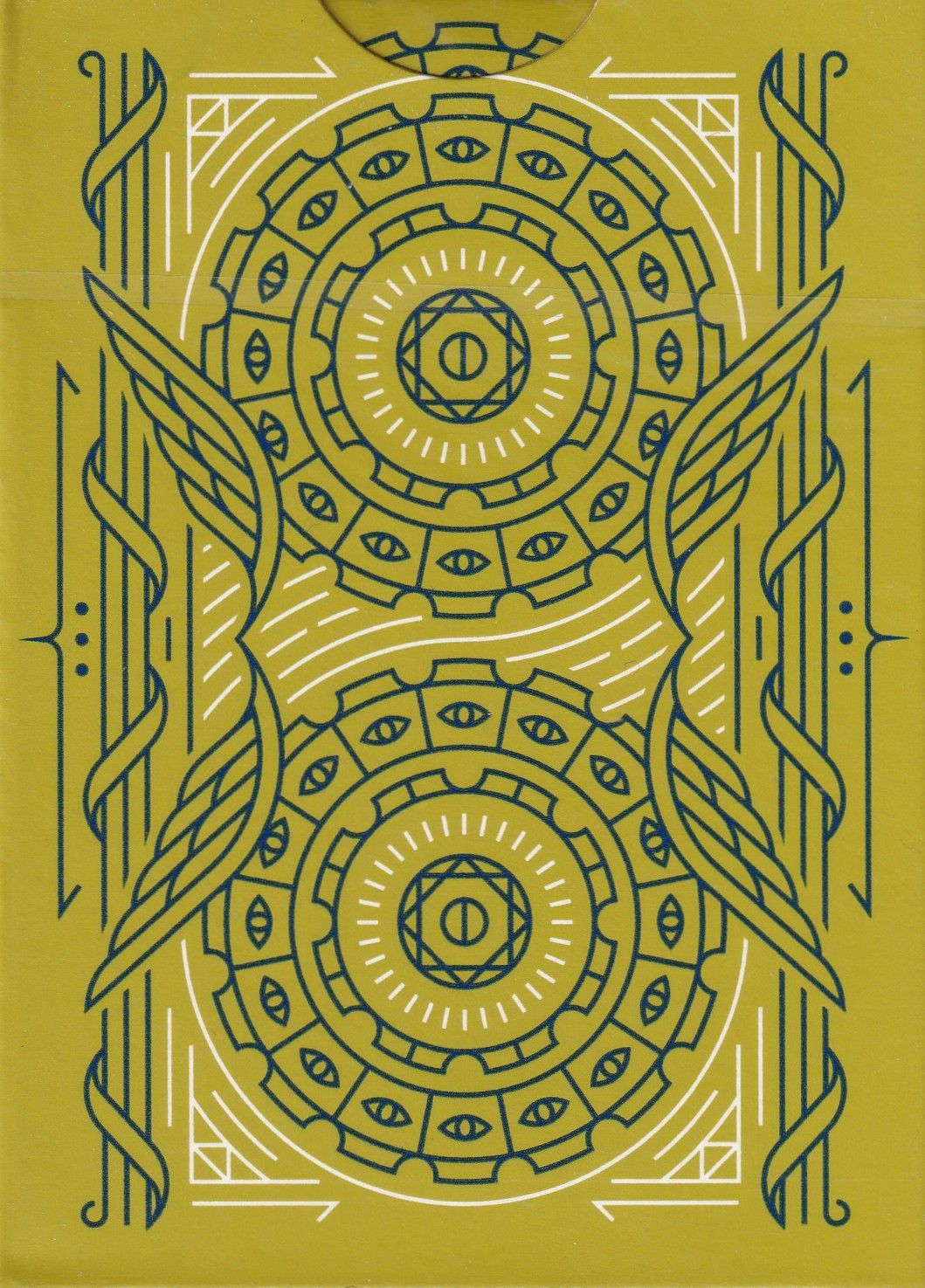 Celestial is inspired by angels and heavenly choirs. Valor features two metallic inks on the cards, and a tuck box, printed by USPCC, with metallic ink.