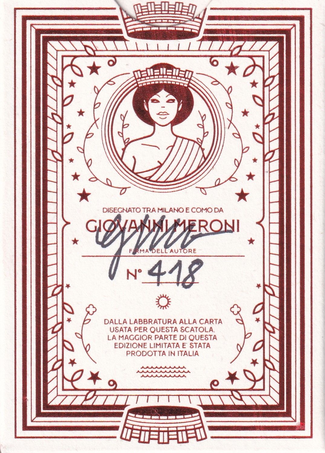 Italia Preziosa and Italia Lucente are the most “Italian” Signature Editions of Thirdway Industries and are Eternal Editions (EE) mainly reserved for TWI Patrons. The decks are hand-signed and numbered in Italy by the author, Giovanni Meroni and feature a lacquered edge print by Doliberg in Bergamo. The luxury tuck box was produced by Boschiero&Newton in Jesolo, with Italian papers and foils. The cards were printed by USPCC in the US with metallic ink.