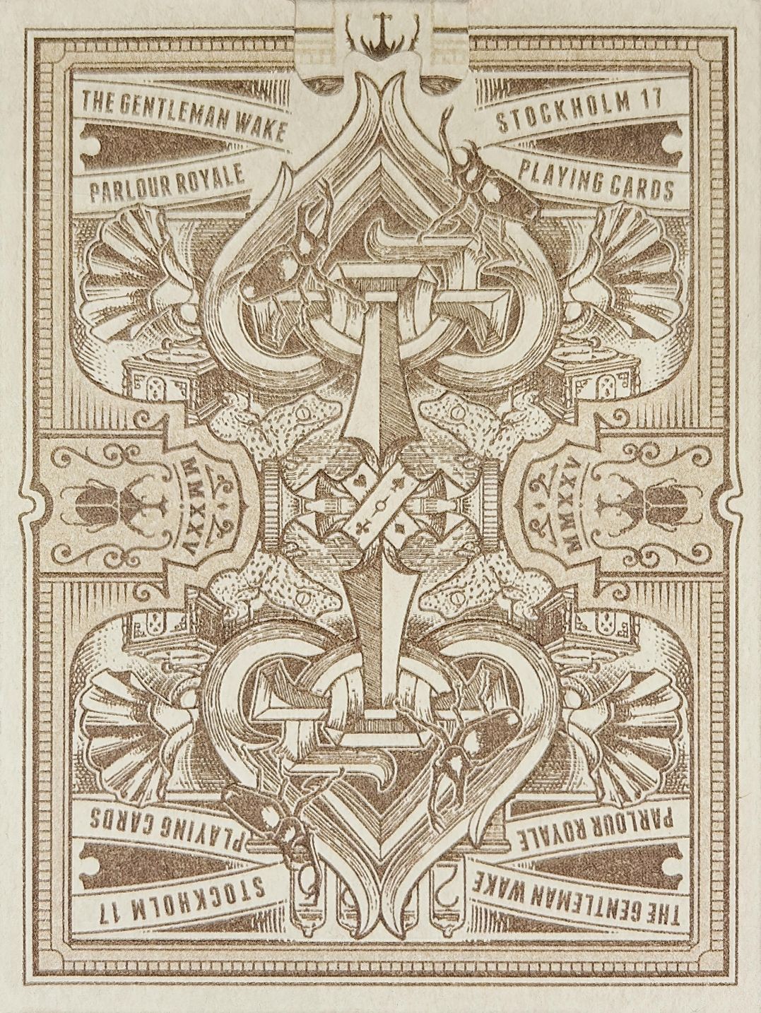 The Parlour Royale represents a celebratory return and revival of the first playing cards release offered by The Gentleman Wake. Designed by Stockholm17 and calling back to the original design seen almost 6 years ago, the Parlour Royale nevertheless includes a gorgeous new back design that highlights the familiar TGW monogram made famous by the original decks whilst delivering exciting new colors. The Parlour Royale Ivory Edition features a gorgeous 4-color printed embossed tuck case featuring a striking owl and beetle ace of spade design. Surrounded by detailed and ornate typography and featuring strong nods to the Victorian stylings that served as inspiration for the design of the deck. Opening the tuck case reveals stunning vermillion edge printed cards blending in perfectly with the red interior of the tuck case. The cards are printed on 310gsm smooth handling paper stock with linen finish and shine illustriously with gold cold foil application.