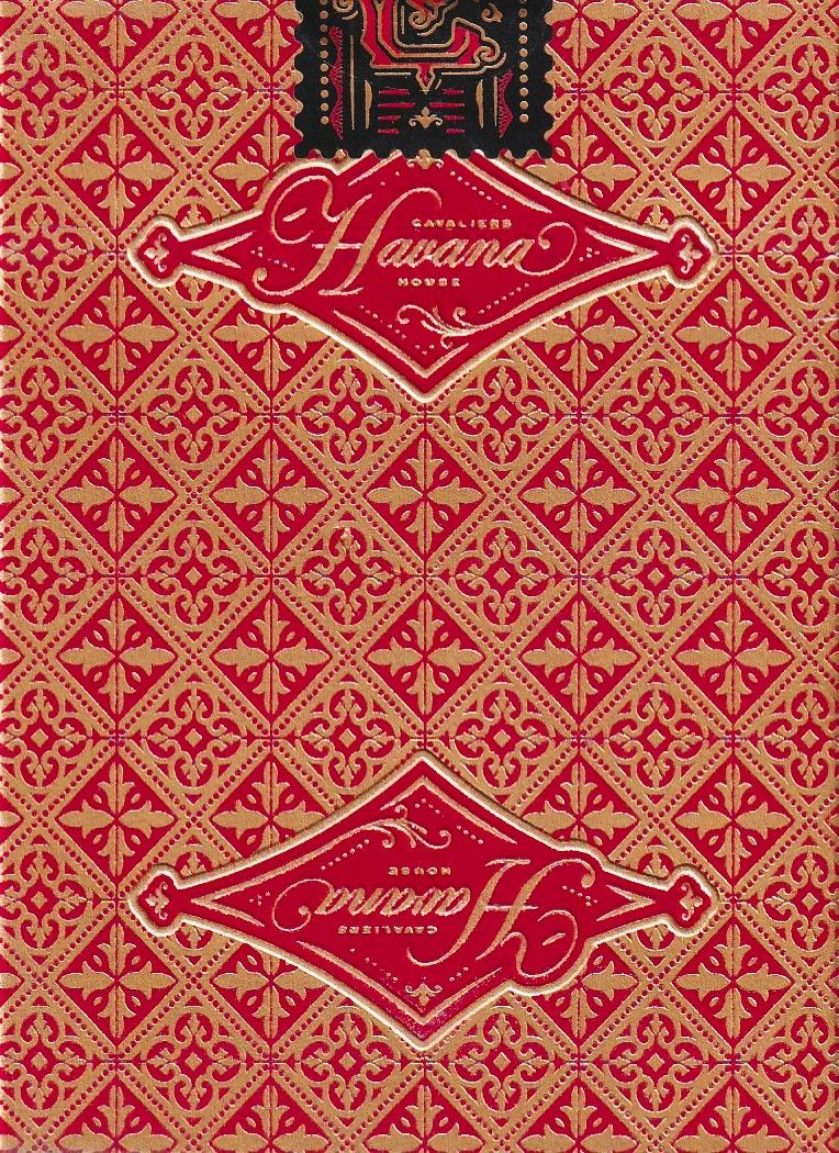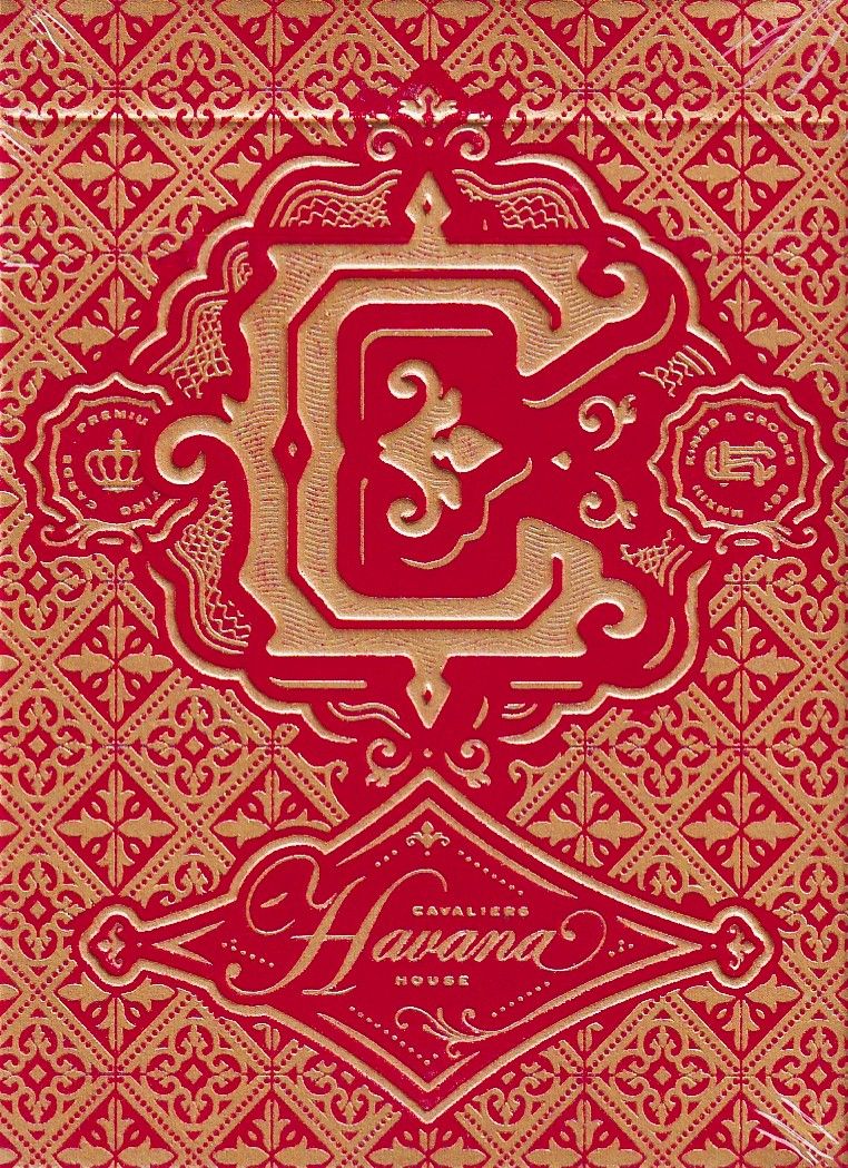 Signature deck of the finest cigar lounge in Havana's old town. A luxury gamblers edition inspired by vintage Cuban tile art and iconic cigar artistry. A gamblers deck with "full-bleed" back design in rich red and vintage dark gold ink, inspired by the very tile patterns that adorn the Havana lounges interior. Complete with fully custom metallic gold ink faces, each more ornate than the last. Flourishing custom courts, endlessly detailed aces and faces, all with the 'Havana House' logo identity set subtly in the background. Dripping with iconic cigar artistry from front to back, the Havana House edition is a vibrant, bold character of it's very own. Housed in a luxurious, soft-touch crimson red box laced with the mesmerizing Cuban tile pattern wrapping each side in shimmering gold foil embossing. Each deck comes securely sealed with a black vintage tax-stamp seal, with the Cavaliers cigars custom "C" brand in gold and red detail, perforated for ease and gentlemanly opening.
