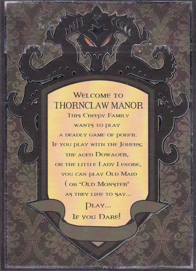 A beautifully creepy illustrated poker deck with a narrative edge featuring the monster family of Thornclaw Manor by Steve Ellis. The cards are official poker deck size on 300g grey core card paper, glossy finish, spot foil, and packaged in a lovingly illustrated deck box with each face card, ace, and joker a lavishly illustrated work of art.