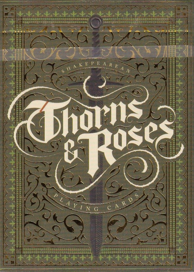 Thorns and Roses is an original set of American playing cards designed by Steve Minty and printed by the United States Playing Card Company (USPCC). Inspired by the works of William Shakespeare, I sought to approach this deck based on the themes prevalent in his work: Life and Death. The themes of life and death are represented with the motif of Thorns and Roses. Thorns embodies the pain of loss and death found in these works, while the Roses the sweetness of love and life. The decks feature four of Shakespeare's best known works: Hamlet, Romeo & Juliet, Macbeth and King Lear. The Roses deck interprets these characters with an item of significance while the Thorns deck depicts their method of death (it's a lot of deaths.)